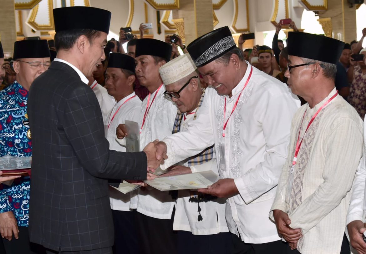 Nasional l jalurnews.com : Presiden Joko Widodo menyerahkan sertifikat bagi tanah wakaf kepada 25 pihak yang ada di Provinsi Bengkulu. Penyerahan tersebut dilangsungkan usai Presiden beserta rombongan melaksanakan ibadah salat Jumat di Masjid Raya Baitul Izzah, Kelurahan Padang Harapan, Kota Bengkulu, Provinsi Bengkulu pada Jumat, 15 Februari 2019.