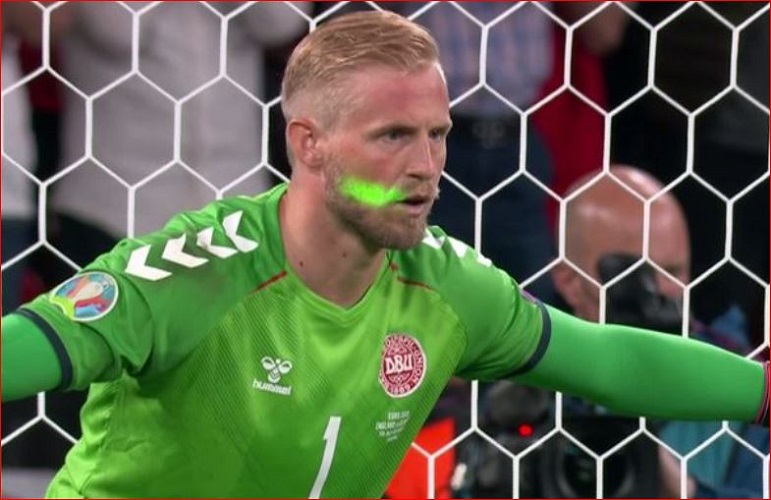Cuplikan gambar televisi menunjukkan Schmeichel dijadikan sasaran oleh seorang penonton yang menggunakan laser hijau ketika kapten timnas Inggris Harry Kane mengeksekusi tendangan penalti pada babak tambahan yang membuat tuan rumah memang 2-1.
