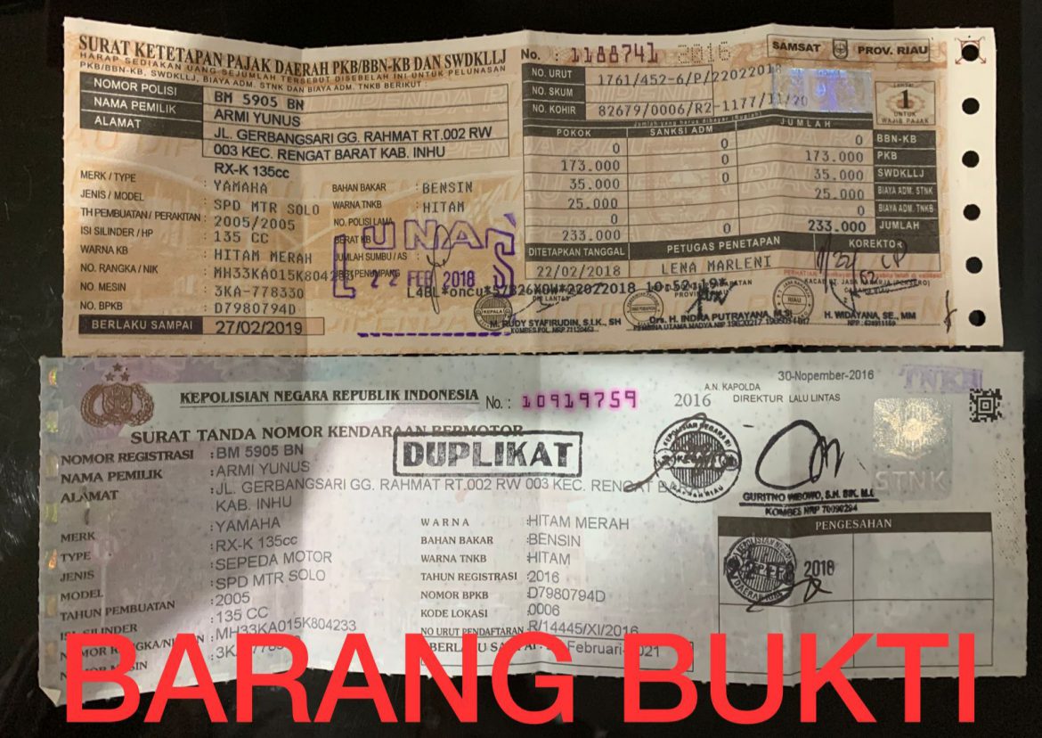 Barang bukti yang berhasil diamankan berupa 1 unit sepeda motor Yamaha RX-K warna biru, 1 kunci sepeda motor, 1 Buah Surat Tanda Nomor Kendaraan (STNK).