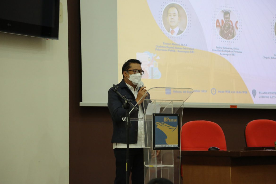 Kegiatan yang digelar di Conference Room IT Center BP Batam ini menghadirkan Asisten Deputi Sistem Informasi Pelayanan Publik Kementerian Pendayagunaan Aparatur Negara dan Reformasi Birokrasi (PAN-RB), Yanuar Ahmad dan Analis Kebijakan Pertama Kementerian PAN-RB, Indra Setiawan sebagai narasumber.