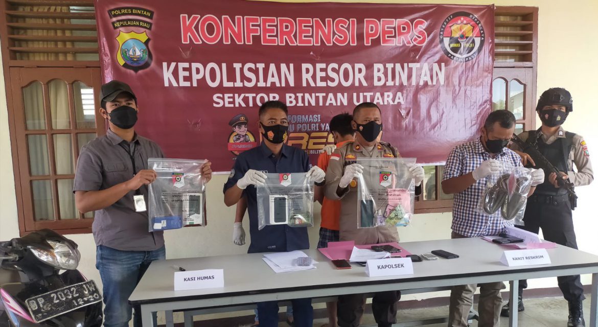 JALURNEWS.COM, Bintan – Kepolisian Sektor (Polsek) Bintan Utara, melakukan konferensi pers dipimpin Kapolsek Bintan Utara, Kompol AKP Suharjono, SE didampingi Kasi Humas Polres Bintan IPTU Alson dan Kanit Reskrim Polsek Bintan Utara, AKP Purbowo, terkait kasus pencurian yang terjadi di awal bulan Desember tahun 2021 lalu, di Teluk Sebung, Kamis (20/01/2022).