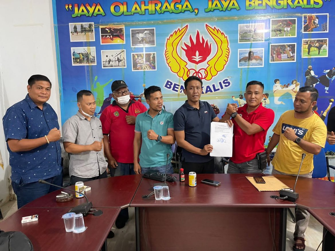 Ketua Umum KONI Kabupaten Bengkalis Dharma Firdaus Sitompul didampingi wakil Ketua Koni Hengki saat menerima SK serta audiensi pengurus Siwo PWI Bengkalis turut mendampingi Ketua PWI Adi Putra dan Sekretaris PWI Kabupaten Bengkalis Agustiawan.