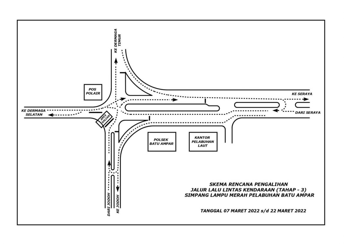 Skema rute lalu lintas mengalami perubahan dari arah Seraya menuju pintu masuk Dermaga Timur dan Dermaga Selatan Pelabuhan Batu Ampar, dimana pengendara akan dialihkan terlebih dahulu melalui simpang Polsek Batu Ampar, kemudian putar balik (U-Turn) menuju Pos Polair tidak jauh dari pintu masuk pelabuhan.