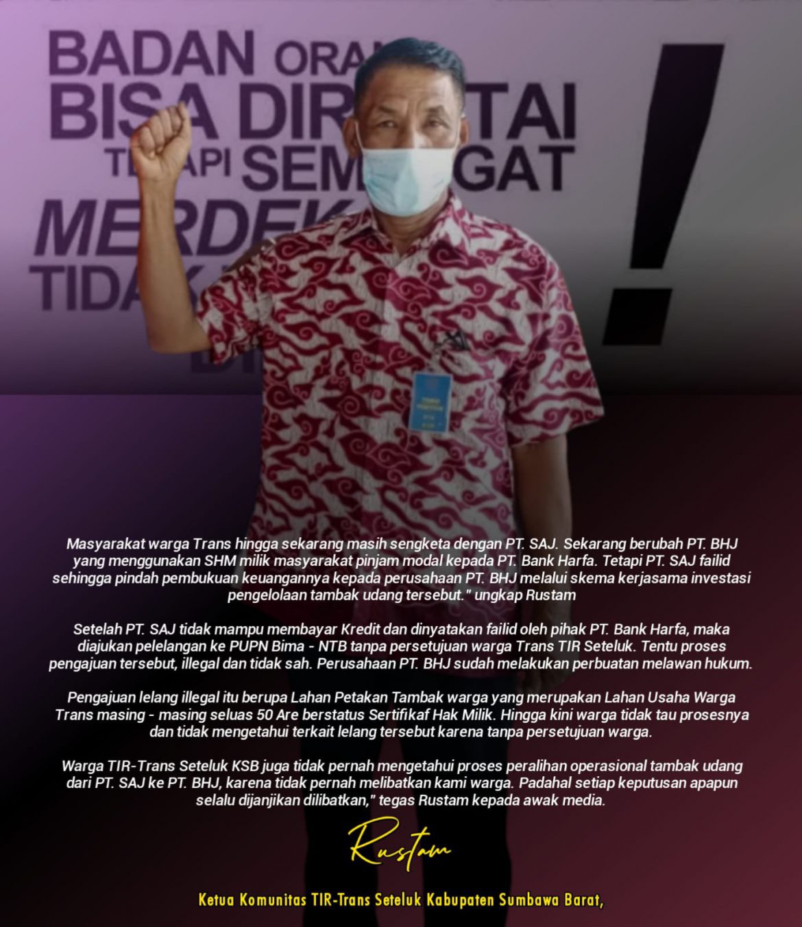 Warga TIR-Trans Seteluk KSB juga tidak pernah mengetahui proses peralihan operasional tambak udang dari PT. SAJ ke PT. BHJ, karena tidak pernah melibatkan kami warga. Padahal setiap keputusan apapun selalu dijanjikan dilibatkan,” tegas Rustam kepada awak media.