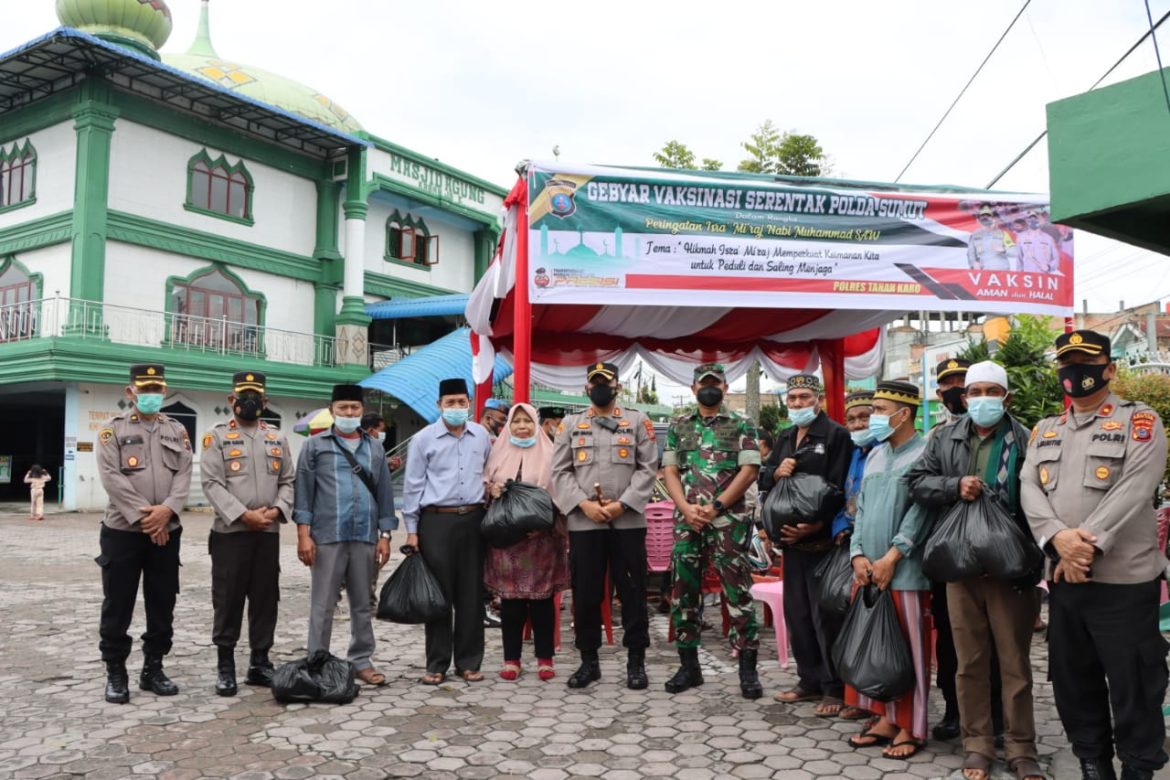 Dalam peninjauan kegiatan Kapolres Tanah Karo bersama Dandim 0205 Tanah Karo juga melaksanakan Bakti Sosial dengan memberikan 30 Paket Sembako kepada Nazir/BKM Mesjid Agung Kabanjahe dan masyarakat yang melaksanakan Vaksinasi mulai dari kalangan Tukang Becak, Pedagang, Supir Angkot dan Tukang Kebersihan.