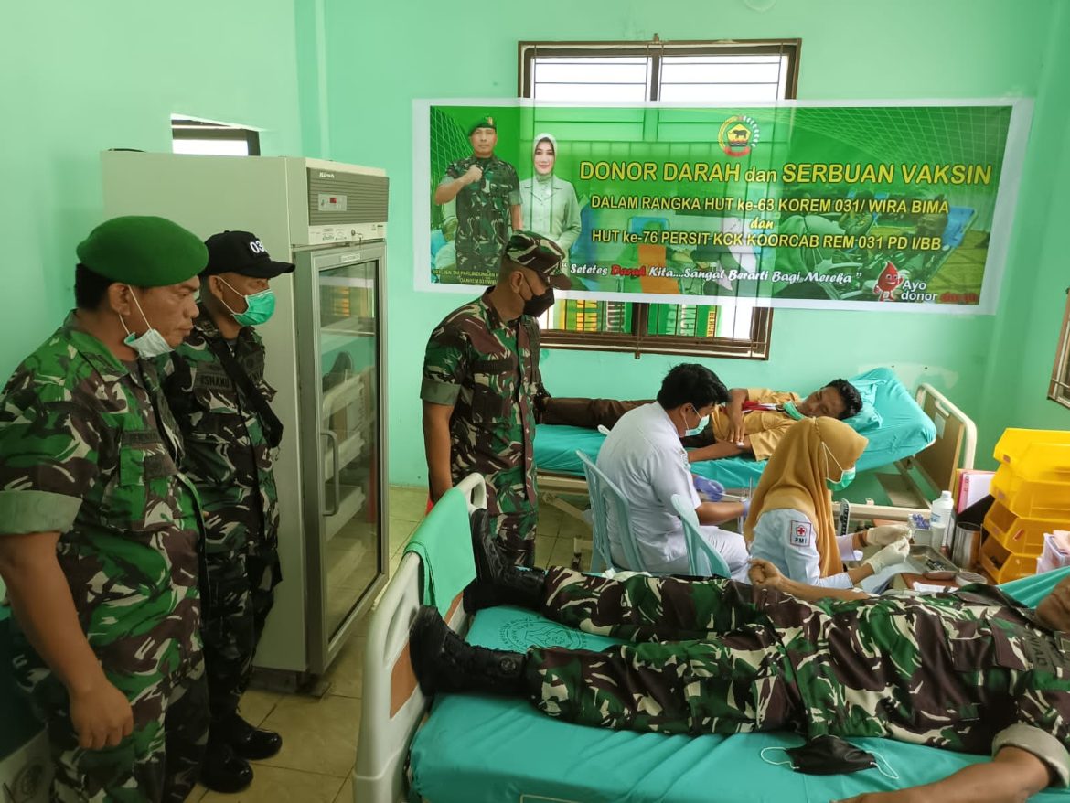 JALURNEWS.COM, BENGKALIS – Komando Distrik Militer (Kodim) 0303/Bengkalis menggelar donor darah dalam rangka Hari Ulang Tahun ke 63 Korem 031/wirabima dan HUT ke 76 persit KCK Koocab Rem 031 PD/BB, Selasa 29 Maret 2022 dipusatkan diunit tranfusi darah RSUD Bengkalis