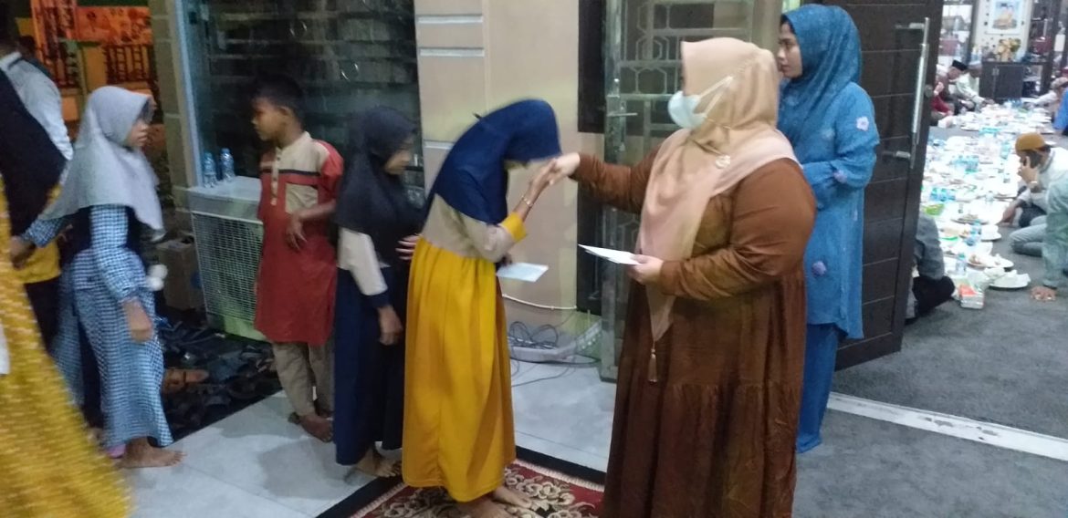 Usai memberikan kata sambutanya, Bupati Kasmarni memberikan santunan kepada puluhan kaum dhuafa dan anak yatim di sekitar Desa Muara Basung.