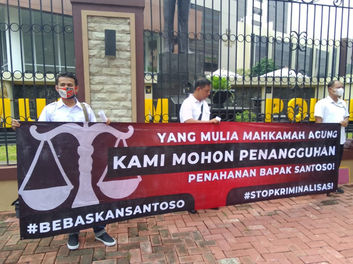 Pada aksi ini, massa juga membentangkan spanduk, salah satunya berisi agar Santoso dibebaskan, lantaran adanya dugaan kriminalisasi. Tak luput pada aksi unjuk rasa ini pengamanan pun diperketat. Aksi pun berjalan dengan damai demi penegakan hukum.***