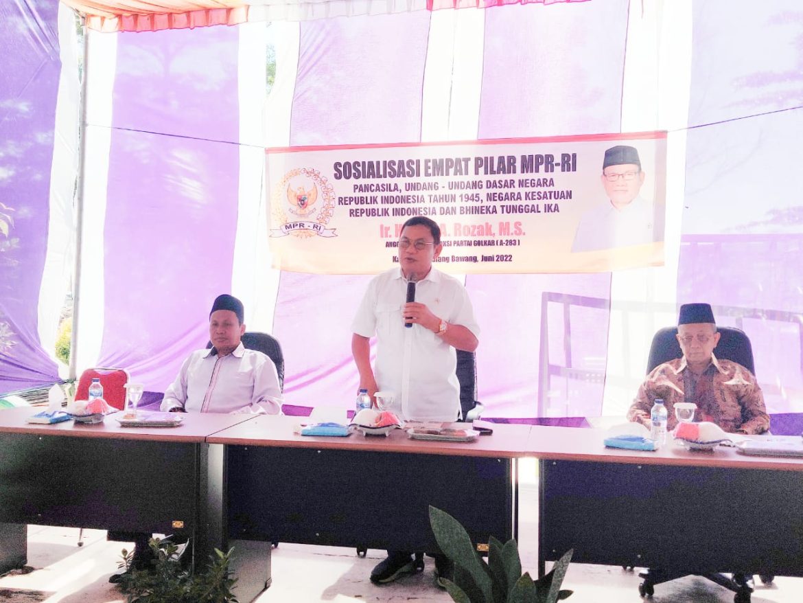 JALURNEWS.COM, Tulang Bawang-Anggota DPR RI Komisi IV, Hanan A Rozak, melakukan sosialisasi Empat Pilar MPR RI (Pancasila, UUD 1945, NKRI, dan Bhinneka Tunggal Ika) di Sekretariat Badan Amil Zakat Nasional (Baznas) Kabupaten Tulang Bawang di Menggala, Kamis (02/06/2022).