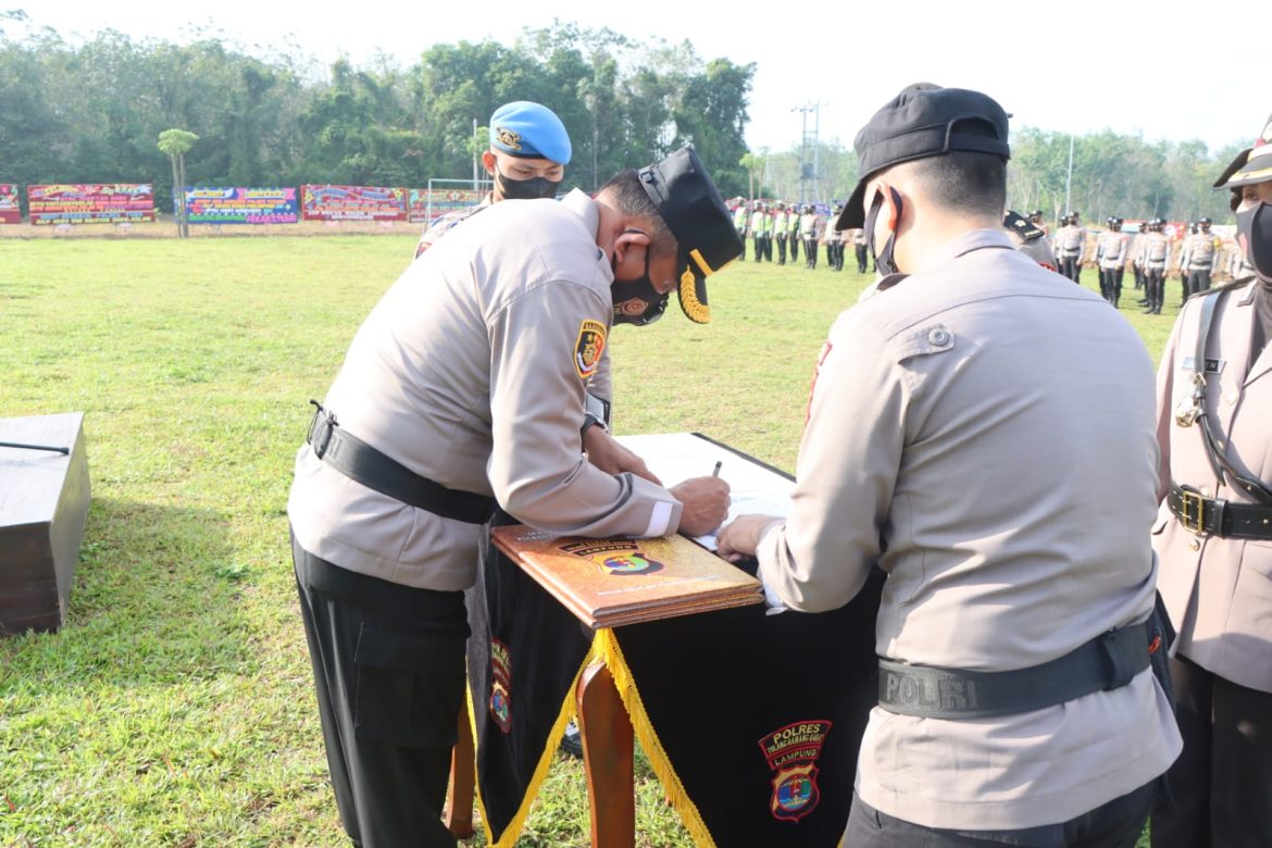 Kapolres Tulang Bawang Barat AKBP Sunhot P. Silalahi S.I.K., M.M memimpin upacara serah terima Jabatan Kabag SDM, Kasat Narkoba dan Kasat Lantas bertempat di halaman apel Mapolres setempat pada Sabtu (4/6/2022).