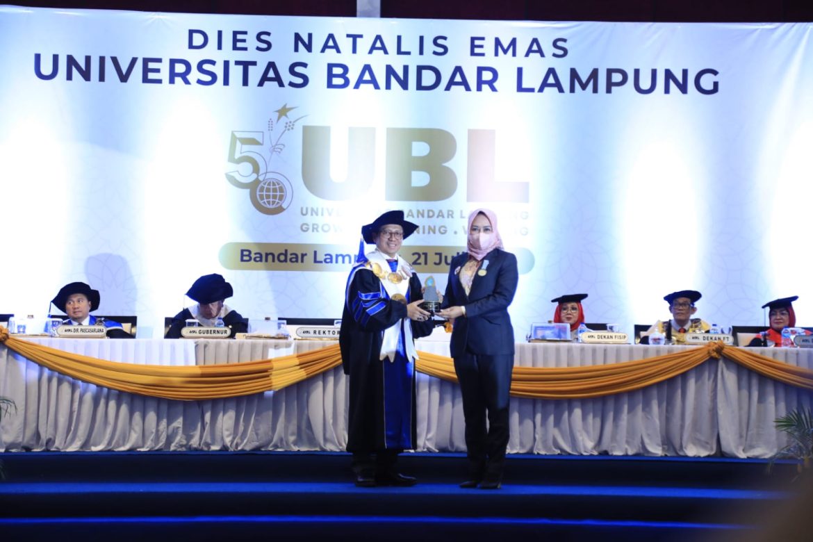 Atas nama pemerintah Provinsi Lampung, saya mengucapkan selamat kepada Universitas Bandar Lampung, yang pada tahun ini memasuki usia 50 tahun atau dikenal sebagai Ulang Tahun Emas,” ucap Gubernur Arinal Junaidi