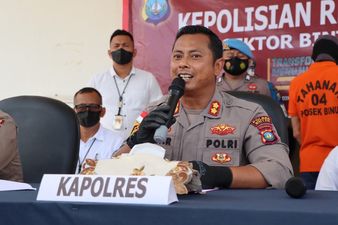 Kapolres Bintan AKBP Tidar Wulung Dahono, S.H., S.I.K., M.H saat konferensi pers di Polsek Bintan Utara didampingi oleh Kapolsek Binta Utara AKP Sopandi, Kabid Rehabilitasi dan Sosial Kabupaten Bintan Syaf Nur bersama tim pekerja sosial DinSos kabupaten Bintan menjelaskan bahwa penangkapan terhadap tersangka YK Als UW (48 Tahun) berdasarkan laporan dari para orang tua korban ke Polsek Bintan Utara pada tanggal 15 Juli 2022 lalu.