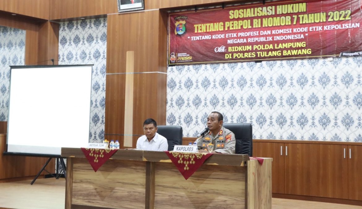 JALURNEWS.COM, Tulang Bawang-Bidang Hukum (Bidkum) Polda Lampung, melaksanakan kegiatan sosialisasi Peraturan Kepolisian Negara Republik Indonesia (Perpol) Nomor 7 Tahun 2022 kepada personel Polres Tulang Bawang.