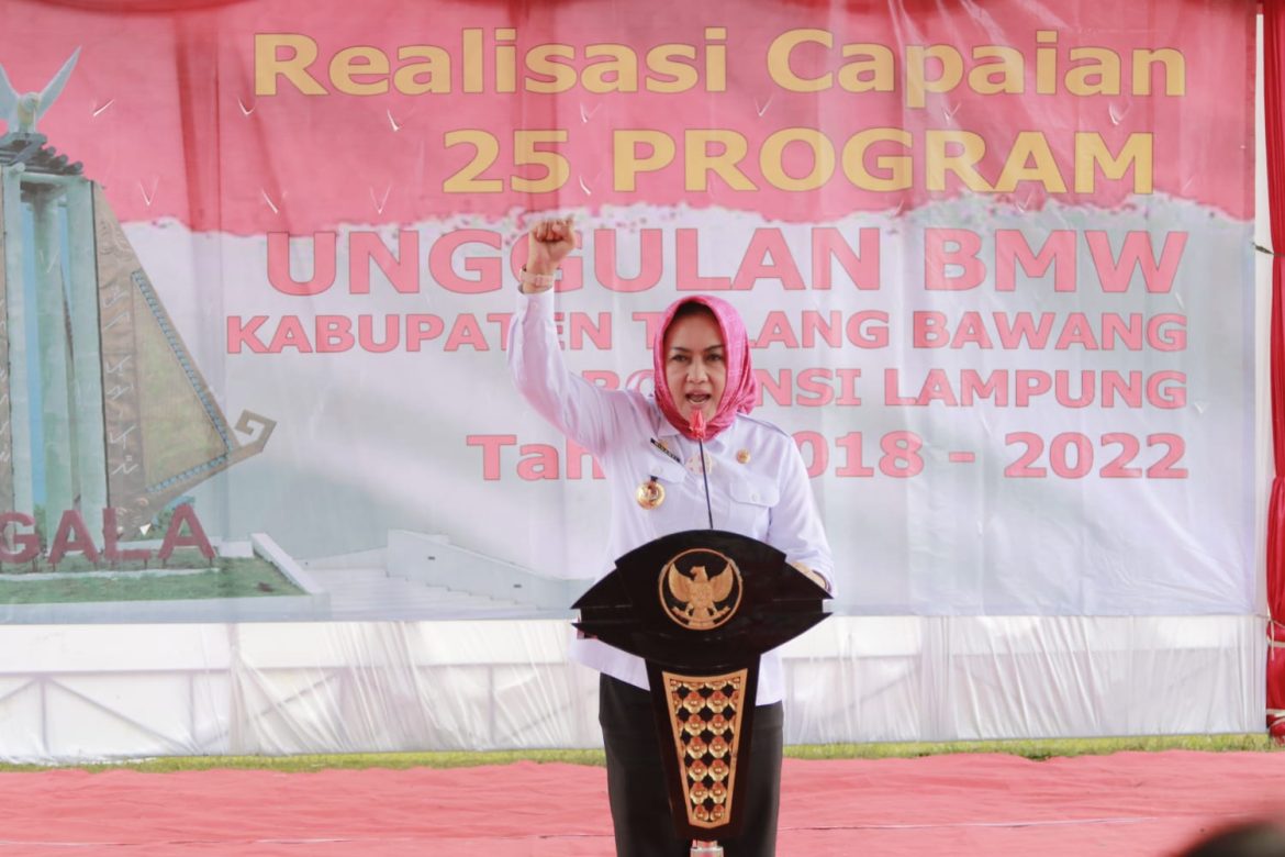 Bupati Tulang Bawang Winarti sangat bangga melihat antusias warga masyarakat Banjar Agung yang sangat mendukung 25 Program BMW Tulang Bawang. Hal ini tercermin dari capaian realisasi 25 Program BMW Tulang Bawang di Kecamatan yang terkenal dengan pusat perekonomian Sai Bumi Nengah Nyappur ini.