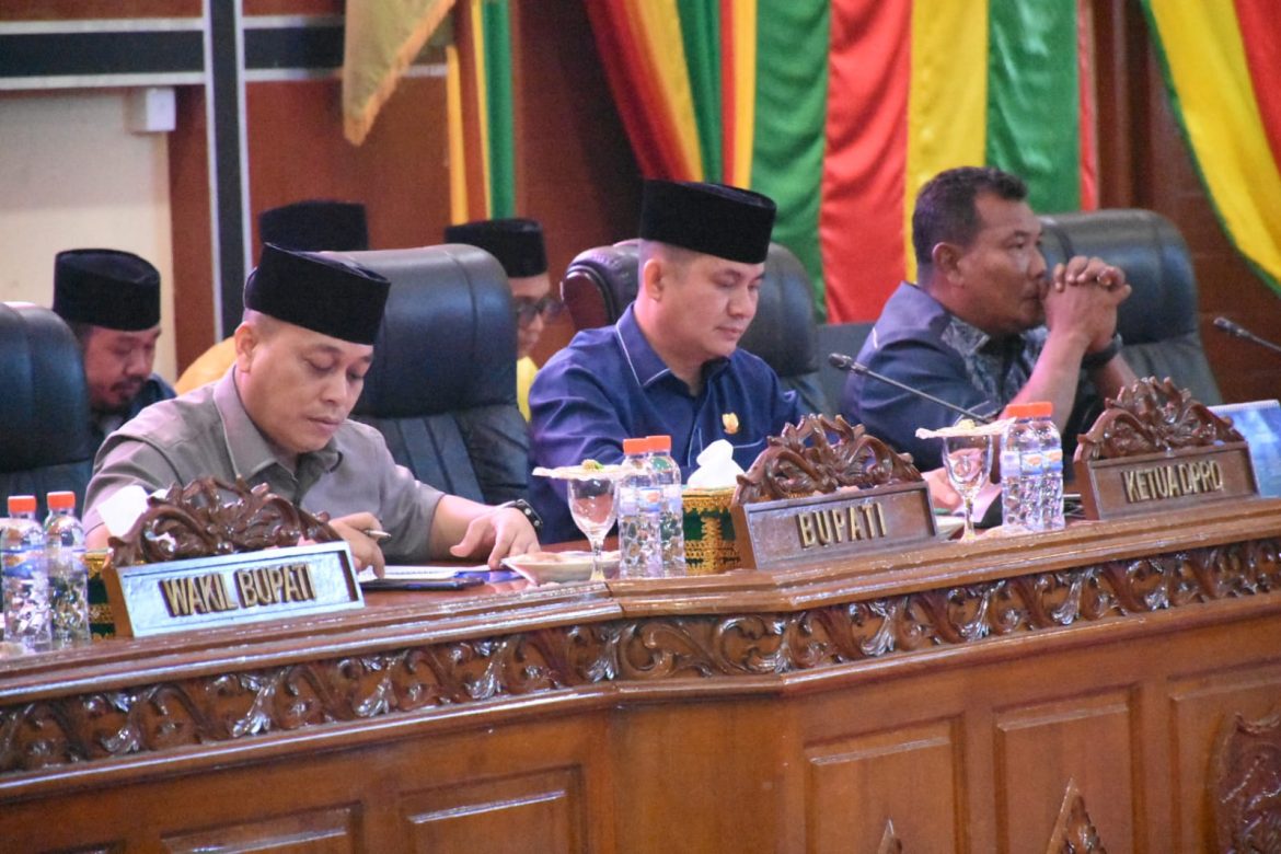 Paripurna dipimpin langsung oleh Ketua DPRD Kabupaten Lingga Ahmad Nashiruddin di dampingi Wakil Ketua I DPRD Kabupaten Lingga Aziz Martindaz, S.Pd. turut hadir pada paripurna tersebut Bupati Lingga M. Nizar, S.Sos, Wakil Bupati Lingga Neko Wesha Pawelloy, Sekretaris Daerah serta Forkopimda, Kepala OPD, Camat/Lurah, Kades/BPD se-kabupaten Lingga.(MS)
