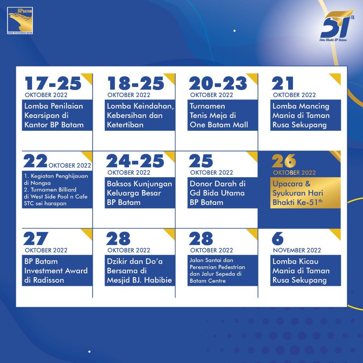 Kepala Biro Humas, Promosi dan Protokol BP Batam, Ariastuty Sirait mengatakan bahwa kalender Hari Bhakti ke 51 BP Batam, telah disusun dengan rangkaian kegiatan seperti perlombaan, bakti sosial, donor darah, penghargaan investasi dan masih banyak lagi.