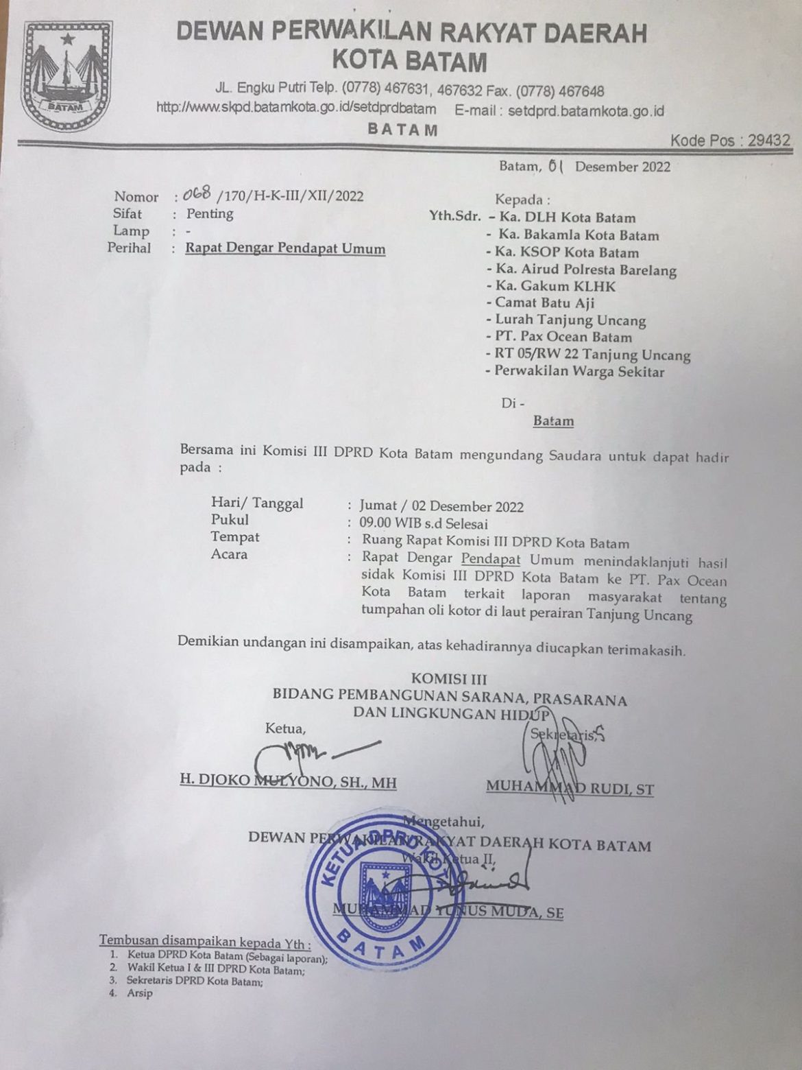 Dengan adanya desakan masyarakat atas tumpah oli kotor pekat hitam di perairan Tanjung Uncang yang sangat berdampak langsung terhadap masyarakat nelayan dan atas aduan masyarakat, DPRD Kota Batam dari komisi III yang membidangi sarana pra sarana dan lingkungan hidup mengudang Pihak PT Paxocean, Kepala DLH Kota Batam,Kepala Bakamla Kota Batam, Kepala KSOP Kota Batam, Kepala Airud Polresta Barelang, kepala Gakum KLHK, Camat Batu Aji,Kurang Tanjung Uncang, RT 05/RW 22 tanjung uncang dan warga sekitar Untuk RDP (Rapat Gelar Pendapat) terkait tumpahan oli kotor yang berada di PT Paxocean dan sekitarnya.