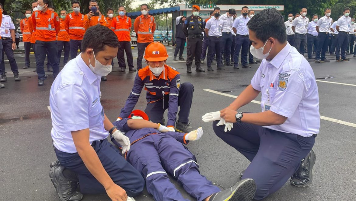 Pada kegiatan apel bulan K3 tersebut juga dilakukan simulasi penanganan terhadap pekerja yang mengalami kecelakaan kerja. Dalam simulasi tersebut menggambarkan Standart Operasi Procedure (SOP) yang harus dilakukan saat terjadi kecelakaan kerja di lingkungan kerja masing-masing, mulai dari pemberian pertolongan pertama, melaporkan kepada pihak yang mampu menangani kondisi kritis, hingga membawa korban ke fasilitas kesehatan terdekat.
