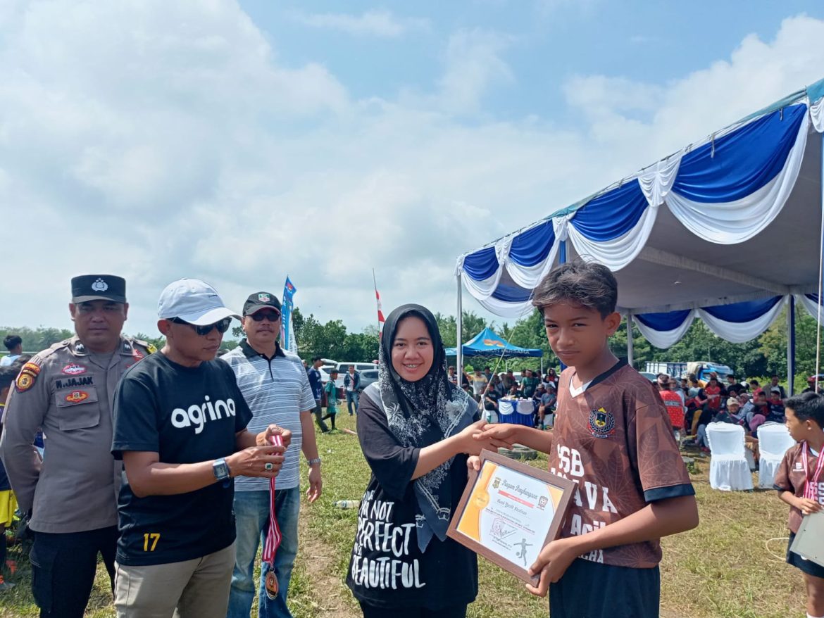 JALURNEWS.COM, Tulang Bawang – Koordinator Dream Come True (DCT) Lampung, Sidik Kurdi menyerahkan sertifikat nasional kepada empat siswa asli putra Tulang Bawang yang menorehkan debut prestasi cabor sepak bola anak Usia 12 dan Usia 13 tahun tingkat nasional pada acara pembukaan open turnamen Sekolah Sepak Bola (SSB) Cassava ke-1 di kecamatan Banjar Agung, Sabtu (18/2/2023).