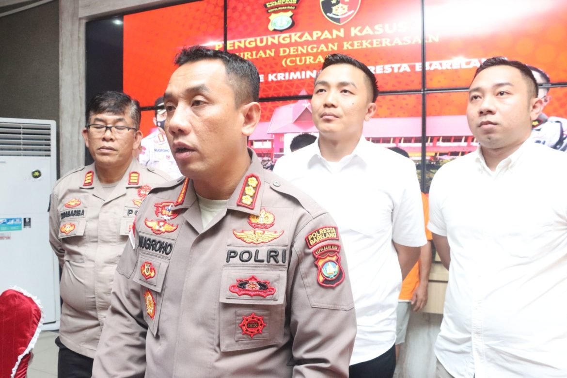 JALURNEWS.COM, BATAM– Kapolresta Barelang Kombes Pol Nugroho Tri N, SH, SIK, MH menggelar Konferensi Pers Ungkap Kasus Tindak Pidana Di muka umum bersama-sama melakukan kekerasan terhadap orang (Pengeroyokan) yang di dampingi oleh Kasat Reskrim Polresta Barelang Kompol Budi Hartono, SIK, MM, Kasihumas Polresta Barelang AKP Tigor Sidabariba, SH, Kanit Reskrim Polsek Batu Ampar Iptu M. Fachri Rizky, S.Tr.K., MH, bertempat di Lobby Mapolresta Barelang. Rabu (01/03/2023)