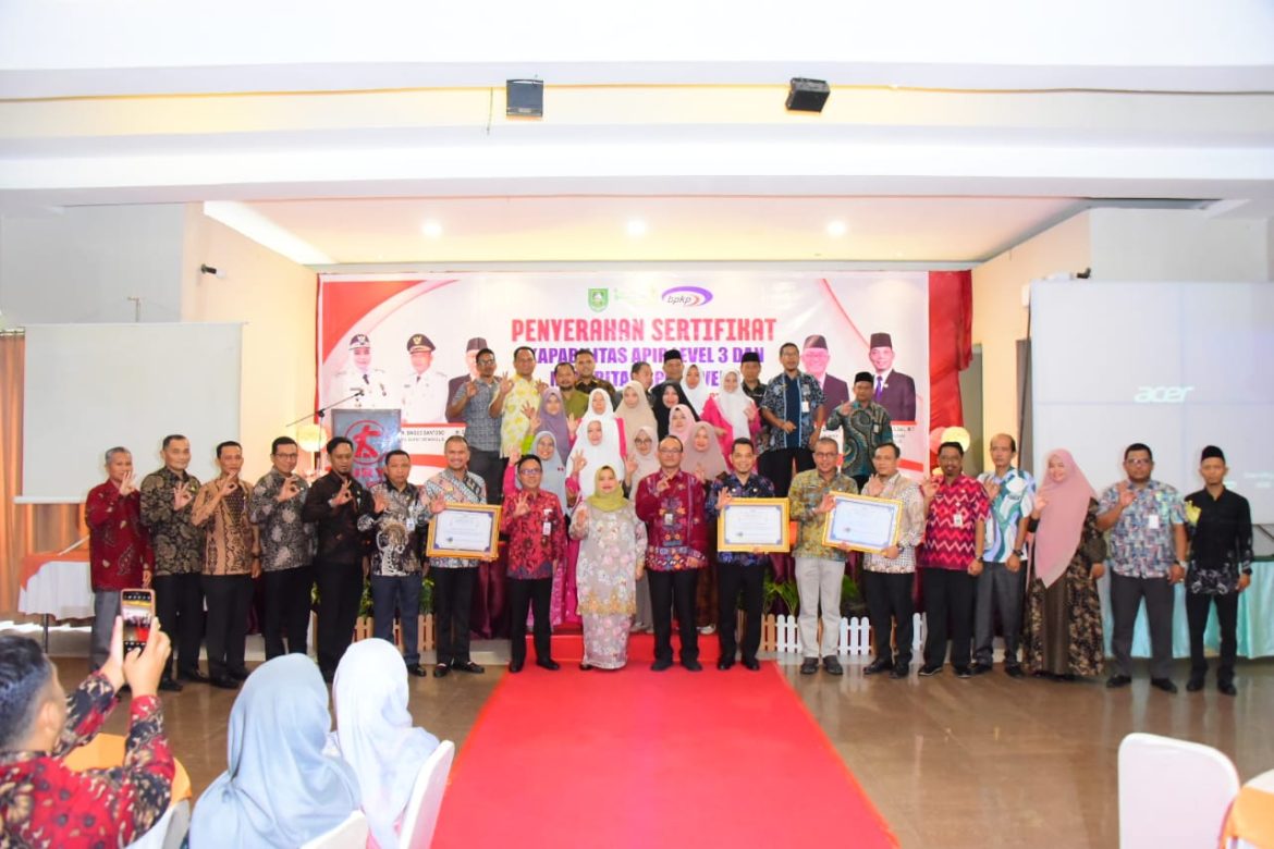 Tampak Hadir pada penyerahan sertifikat tersebut Plt Sekda Bengkalis dr. Ersan Saputra, Asisten Perekonomian dan Pembangunan Toharudin, Asisten Administrasi Umum Aulia, Inspektur Bengkalis Radius Akima serta Pejabat Tinggi Dilingkup Pemkab Bengkalis serta Camat Se-Kabupaten Bengkalis.(INF)
