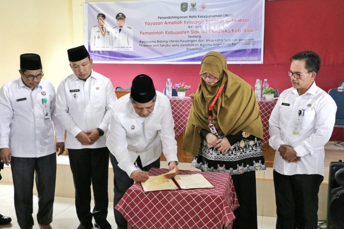 Penandatanganan perjanjian kerjasama itu, dilakukan Bupati Siak Alfedri di saksikan Wakil Bupati Siak Husni Merza dan kepala Dinas Sosial Wan Idris. Bupati Siak Alfedri mengucapkan syukur atas penandatanganan MoU yang dilaksanakan antara Yayasan Amaliah Keluarga Sakinah Indonesia, dengan pemerintah kabupaten Siak dan Baznas kabupaten Siak untuk penderita disabilitas di kabupaten Siak.