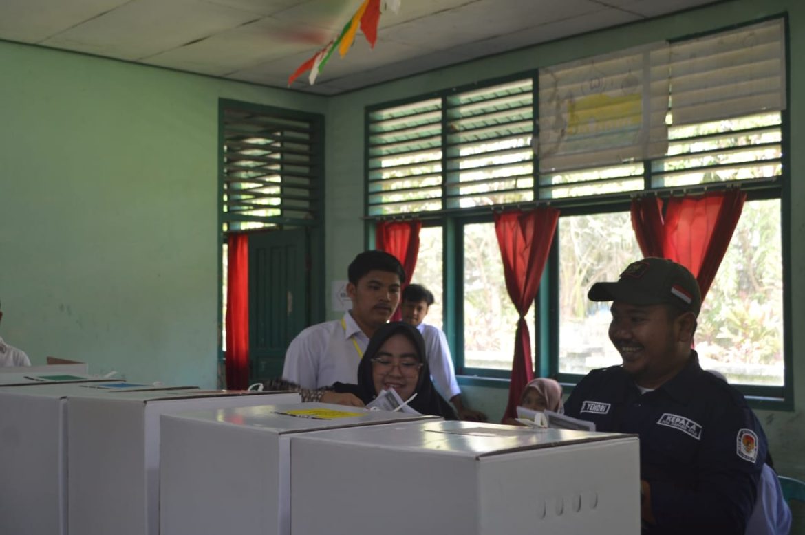 BENGKALIS – Pj Desa Simpang Ayam Yulfi Yendri bersama istri melakukan hak suaranya di Desa Simpang Ayam tepatnya di TPS 02 dari 4 TPS, jalan utama Simpang Ayam kecamatan Bengkalis kabupaten Bengkalis,