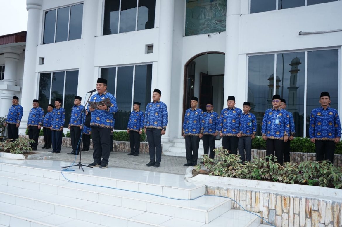 Terlihat Sekretaris Daerah Kabupaten Asahan, Para Asisten, Staf Ahli Bupati Asahan, OPD dan ASN di Lingkungan Pemerintah Kabupaten Asahan ikuti upacara Hari Kesadaran Nasional dengan begitu khitmad.(Bangun)