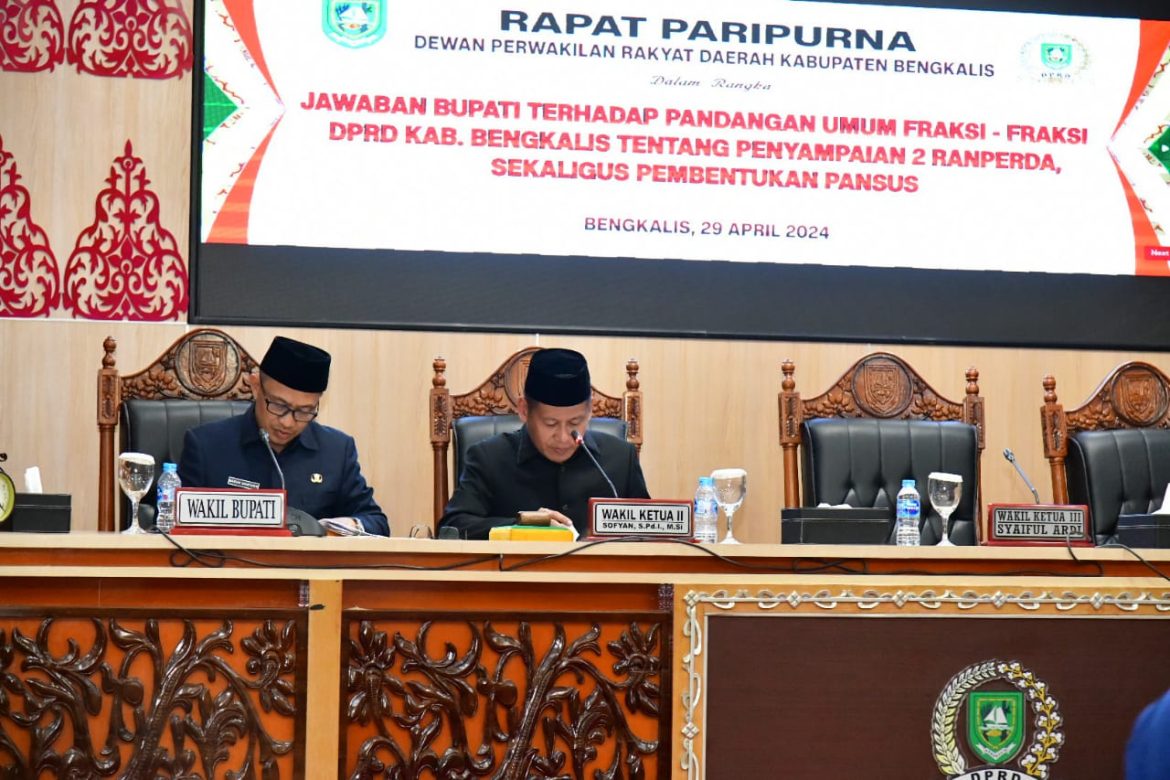 BENGKALIS – Pada Sidang Paripurna DPRD terhadap Ranperda tentang Perubahan atas Peraturan Daerah Kabupaten Bengkalis nomor 46 tahun 2021 tentang Pembentukan Perseroan Daerah PT. Bumi Laksamana Jaya dan Ranperda tentang Penyelenggaraan Penanggulangan Bencana Kabupaten Bengkalis, dijawab Bupati Bengkalis Kasmarni diwakili Wakil Bupati H Bagus atas pandangan umum fraksi-fraksi, Senin malam, 29 April 2024.