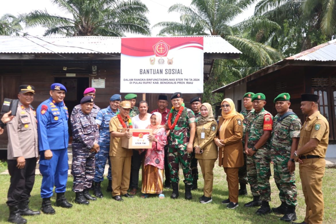 RUPAT – Bupati Bengkalis Kasmarni, perwakilan Wabup Bagus Santoso, mendampingi Paban VI/Taswilnas Ster TNI Opsla Kolonel Laut (P), Arief Budiman, M.Tr, menyerahkan secara langsung program Bantuan Sosial (Bansos) Pembinaan Fungsi Perbatasan Wilayah Nasional (Binfungtaswilnas) tahun 2024, dari Mabes TNI kepada masyarakat Pulau Rupat, Selasa, 7 Mei 2024.