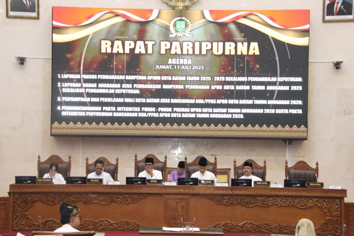 JALURNEWS.COM, Batam – DPRD Kota Batam secara resmi mengesahkan Rancangan Peraturan Daerah (Ranperda) tentang Rencana Pembangunan Jangka Menengah Daerah (RPJMD) Kota Batam Tahun 2025–2029 dalam rapat paripurna yang digelar Jumat (11/7/2025) siang. Agenda ini menjadi fokus utama dari empat poin penting yang dibahas dalam paripurna yang dipimpin langsung oleh Ketua DPRD Haji Muhammad Kamaluddin, didampingi Wakil Ketua I Haji Aweng Kurniawan dan Wakil Ketua II Budi Mardiyanto SE MM.