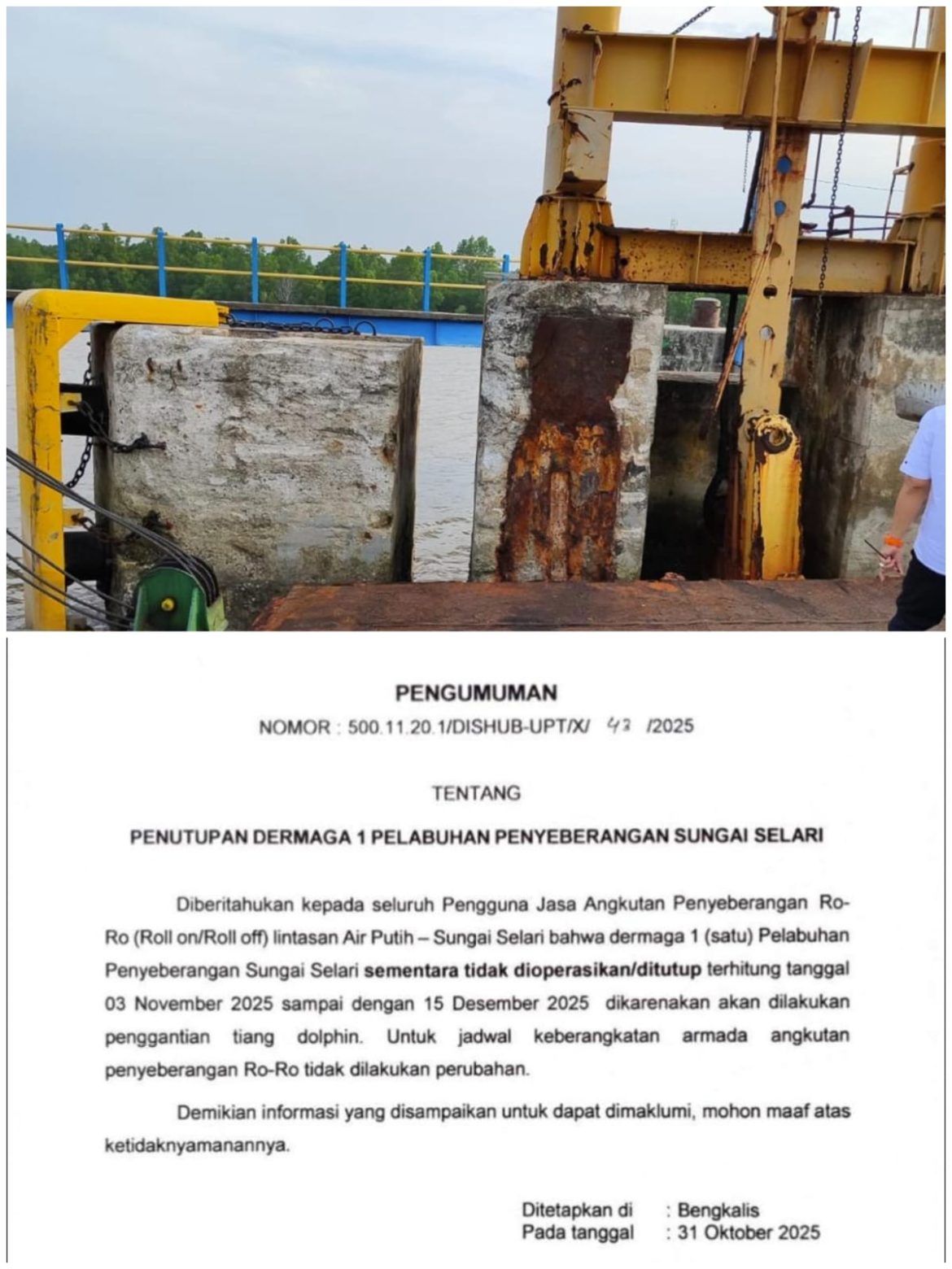 JALURNEWS.COM, Bengkalis – Dinas Perhubungan Kabupaten Bengkalis melalui Unit Pelaksana Teknis Penyeberangan mengumumkan bahwa Dermaga 1 Pelabuhan Penyeberangan Sungai Selari akan ditutup sementara mulai tanggal 3 November 2025 hingga 15 Desember 2025. Penutupan ini dilakukan untuk melakukan penggantian tiang dolphin.