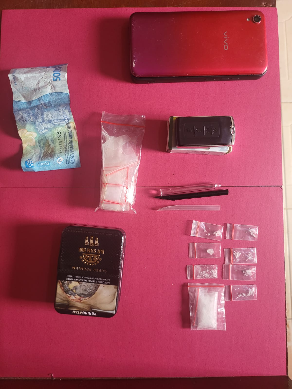 “Dari hasil pemeriksaan awal, terduga pelaku mengaku berinisial SH (33 Tahun), warga Desa Air Panas, Kecamatan Pendalian IV Koto. Saat dilakukan penggeledahan badan, petugas menemukan 8 (delapan) paket narkotika jenis sabu yang disimpan di dalam sebuah kotak rokok merek Dji Sam Soe, dengan berat total lebih kurang 3,08 gram. Selain itu, turut diamankan sejumlah barang bukti lainnya berupa plastik klip bening, kaca pirex, pipet skop, satu unit timbangan digital, satu unit handphone, serta uang tunai sebesar Rp50.000,” ucap Kapolsek