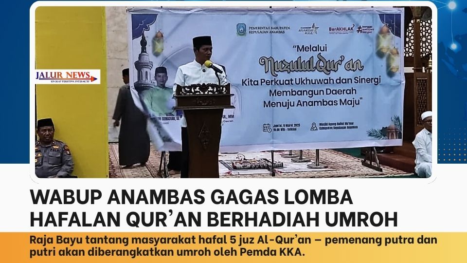 JALUR NEWS, Anambas — Wakil Bupati Kepulauan Anambas Raja Bayu menggagas program lomba hafalan Al-Qur’an berhadiah umroh bagi masyarakat. Gagasan ini disampaikan saat Peringatan Malam Nuzul Qur’an 1447 H di Masjid Agung Baitul Ma’mur, Tarempa, Jumat malam, 6 Maret 2026.