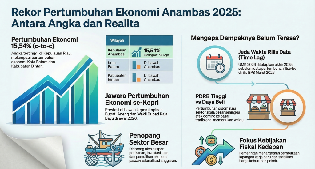 JALUR NEWS, Anambas – Kabupaten Kepulauan Anambas baru saja menorehkan prestasi membanggakan di awal tahun 2026. Berdasarkan rilis resmi Badan Pusat Statistik (BPS), di bawah kepemimpinan Bupati Aneng dan Wakil Bupati Raja Bayu, pertumbuhan ekonomi Anambas pada Triwulan IV tahun 2025 meroket tajam hingga 17,36 persen (y-on-y), dengan total kumulatif setahun mencapai 15,54 persen. Angka ini secara absolut menempatkan Anambas sebagai jawara pertumbuhan ekonomi tertinggi di Provinsi Kepulauan Riau, mengalahkan Batam dan Bintan.