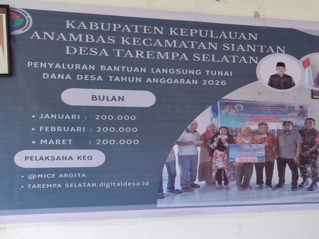 JALUR NEWS, Anambas – Pemerintah Desa Tarempa Selatan resmi merealisasikan penyaluran Bantuan Langsung Tunai Dana Desa (BLT-DD) Tahun Anggaran 2026 pada Jumat (13/3/2026) pagi. Sebanyak 26 Keluarga Penerima Manfaat (KPM) langsung menerima rapelan bantuan untuk tiga bulan sekaligus (Januari, Februari, dan Maret) dengan total Rp600.000 per keluarga.