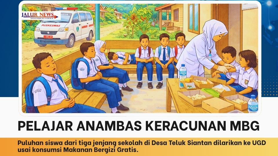 JALUR NEWS, Anambas – Puluhan pelajar dari tiga jenjang pendidikan di Desa Teluk Siantan, Kecamatan Siantan Tengah, Kabupaten Kepulauan Anambas, diduga mengalami keracunan massal setelah mengonsumsi Makanan Bergizi Gratis (MBG) yang dibagikan pada hari ini,Rabu, 15 April 2026, Siang. Korban mencakup siswa TK/PAUD, SD, hingga SMP, dengan gejala dominan berupa sakit perut, mual, dan muntah-muntah.